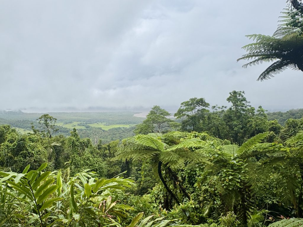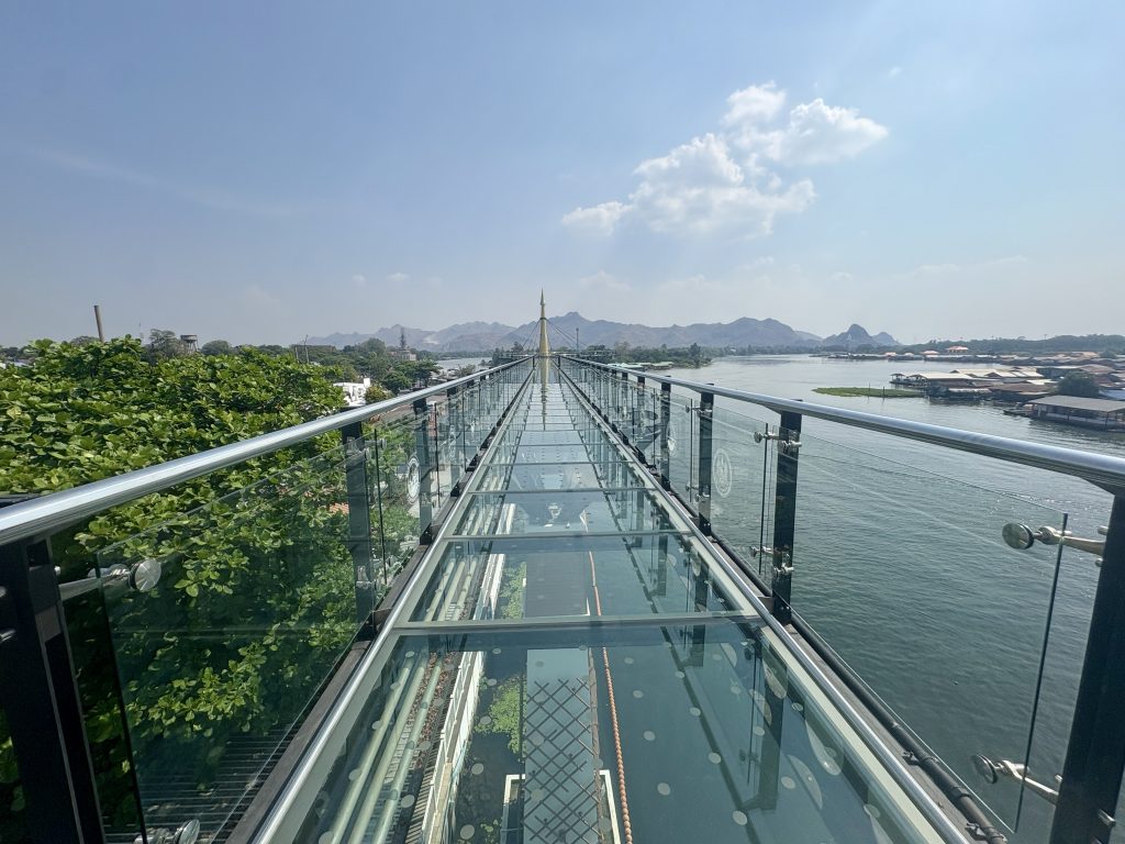 Breakfast the next morning was on the riverside terrace with a view of the bridge. Weather was hot and humid with another severe heat warning in place. We walked down to the Death Railway Museum and spent the next couple of hours browsing through. We’d been pretty slack with planning our days, so we stopped for a coffee and booked a private taxi to take us to Hellfire Pass and waterfall the next day. Across the road from the museum was the cemetery managed by the CWG commission, we had a walk through looking at the thousands of grave stones for those that had lost their lives during the conflict. Before leaving, we wrote in the cemetery logbook. Next up we found a motorbike tuk tuk, negotiated a price to take us to the glass walkway. We couldn’t face walking the twenty minutes in the blistering heat, so paid £1.10 for a ride. As we approached the walkway, it was deserted and thought it was closed, we found the kiosk, paid for the tickets, got our shoe covers and took the lift up. Great views over the Kwai and we were the only there. A really odd modern addition to a traditional authentic Thai town. Picked up another tuk tuk back to the hotel, it was slightly more expensive but he took us the long way round.