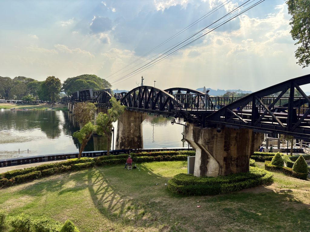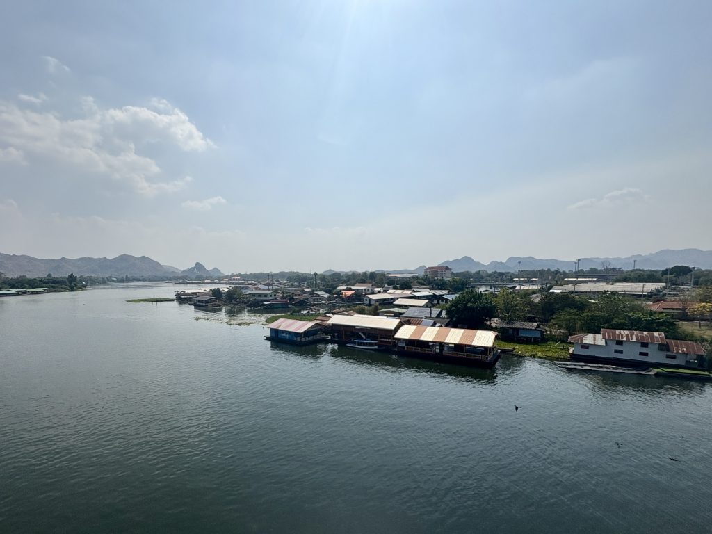 Kanchanaburi – A taxi took us the two hour and forty minute drive from Bangkok. Arrived at the hotel and checked in . The hotel was lovely and on the River Kwai, a little way from the town but just a ten minute walk to the bridge. As per our usual procedure we found a 7-11 and stocked up with snacks & drinks. We were heading out to find some dinner, when a thunderstorm blew in. Rain stopped play and we ate at the hotel. The storm rumbled on for the next couple of hours.