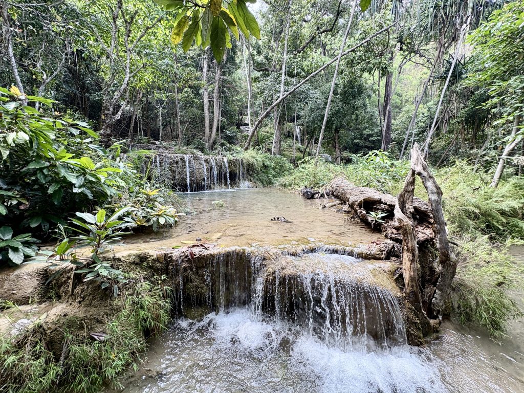 The next morning we had an early start, first was Hellfire Pass and we were there for when they opened at 9am. Hellfire Pass (Konyu Cutting) is the name of a railway cutting on the Death Railway which was built with forced labour during World War II. Visited the discovery centre then walked down through the cutting to the memorial and back. We both questioned how anybody survived the cruel treatment and harsh conditions. On a more cheerful note we then headed to the Erawan Waterfall, it has seven tiers. By now it was really hot and when we got there we decided to walk to the fourth level. Once there we were scared of missing “something” so we pushed on and made it to the top, it took about an hour. You can swim in the pools at some levels, however you had to hire and wear a life jacket (too hot to wear or carry) and there are fish that nibble you. It was a hard no from M. Once back down we headed back to Kanchanaburi.
