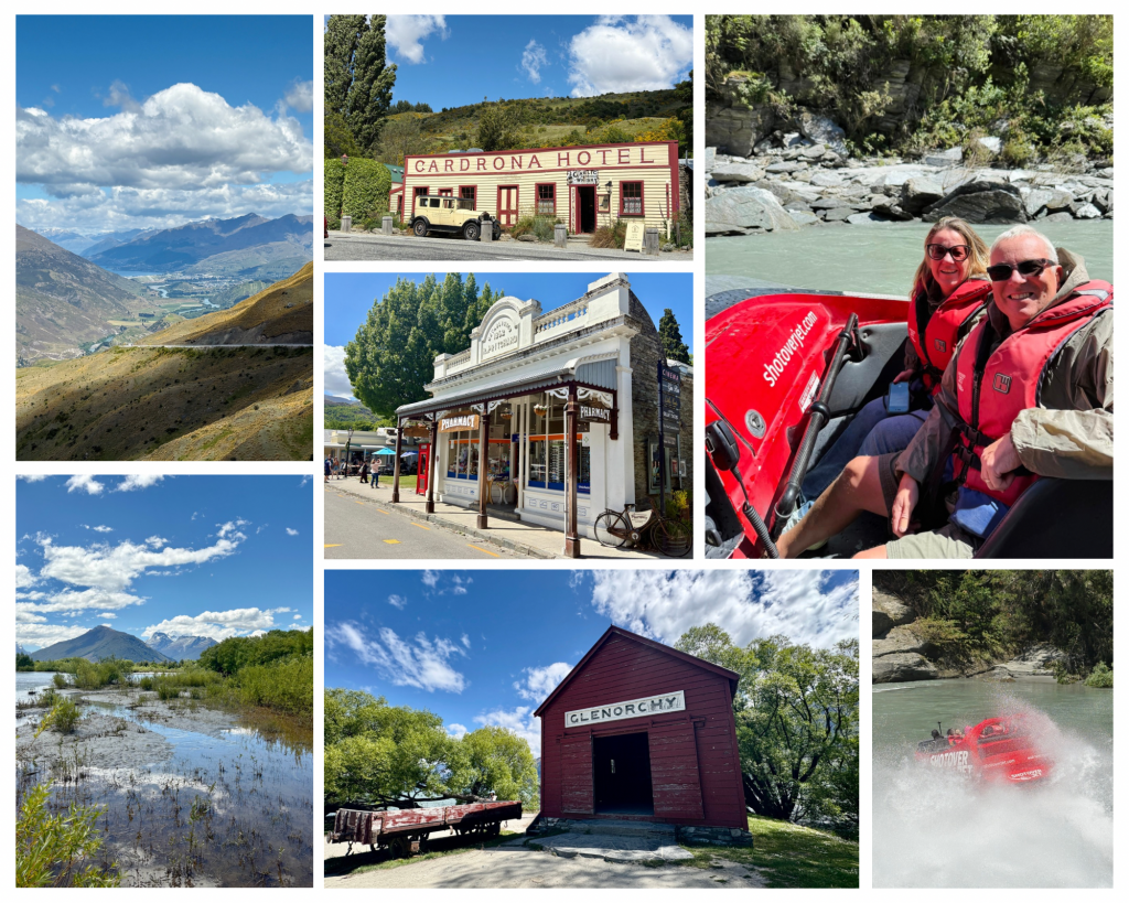 Off to the adventure capital of New Zealand – Queenstown, for our longest stay of recent times, three nights.  Nothing planned in advance however bungy jumping wasn’t going to be on the list. First, the journey down was another good un!  Cardrona bra fence was the first stop, not your usual tourist attraction but back in 2000, four local women hung their bras on a fence on their way home on New Years eve.  Since then tourists from all over the world leave their bras behind and it has raised hundreds of thousand dollars for the Breast Cancer Foundation, NZ.  A short drive away is the oldest and most photograhed hotel in NZ, the Cardrona Hotel.  Onwards over the Crown Range and stopped off at the summit overlooking Queenstown.  It was here we discovered that Queenstown was founded by one of the first European explorers/settlers back in 1827 – WG Rees.  Of course G is convinced he is a long lost ancestor.  Had to laugh at the caption on the monument – “The Promise Land Of Rees”  Checked in and caught up on admin and phone calls to family and friends.  After a bit of research we found the perfect activity to do.  A jet boat ride up the Shotover Canyon, so with that booked we set off to drive to a local town that had been on our to visit list – Arrowtown.  A historic gold mining town where Chinese immigrants had settled in the 1800’s during the Otago Gold Rush.   Once again the town had a nice mix of independent shops and an attractive main street.  G had his eye on a gold panning kit, but we had to leave it behind, no luggage space.   Walked through the partially restored Chinese settlement, to learn about the history and hardships the Chinese immigrants faced.  Drove back to Queenstown, took a walk through the town, found the WG Rees statue  (with a sheep) – obligatory photo of G next to it. Wandered along the lake towards the edge of town and the beaches.