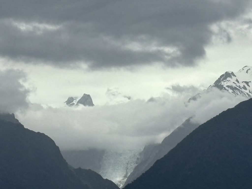 Fox Glacier was our next destination with stops on the way, including Franz Josef for a lunch stop and then Gillespie Beach – which was an 8 mile drive down a bumpy track and finally a viewing point for the glacier.  The second day it was thick with cloud and raining, we walked the track around Matheson Lake. If the weather is settled the lake provides a perfect mirror reflection of the mountains behind.  We were out of luck on our visit!   The second walk of the day took us up the side of the Fox river to another glacial viewpoint.  It was amazing to watch the glacier being exposed then covered again by the moving low level cloud.  Delicious dinner in the Cook Saddle Cafe & Saloon rounded off our stay in Fox Glacier Township.