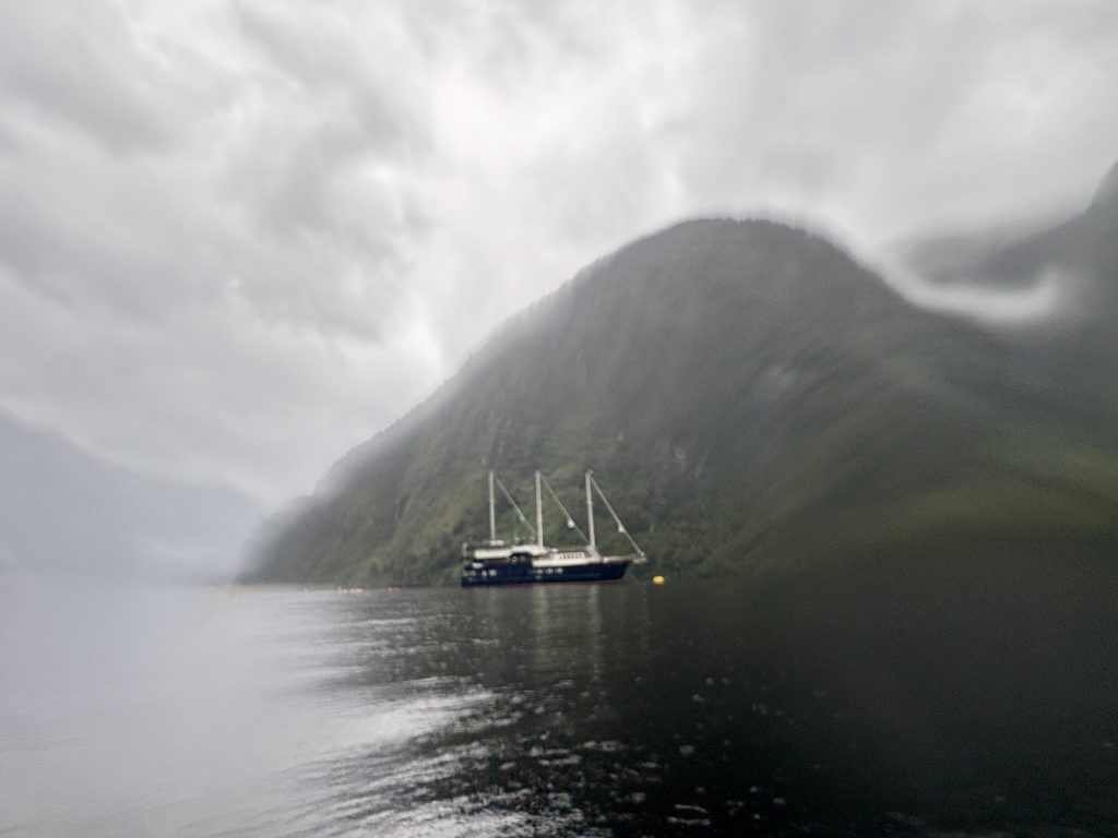 We woke up the next morning to wind speeds of 110kph, torrential downpours and poor visibility. Yes it was the day we were travelling to Doubtful Sound for our overnight trip on the Fiordland Navigator. We’d selected Doubtful as it is remote! To reach the harbour where the Navigator sails from, involved a forty five minute catamaran trip across Lake Manapouri, then another forty five minute coach trip to Deep Harbour. Eventually we boarded the boat and after a quick safety briefing and welcome, we were on our way. We sailed along the sound to the Tasman sea and were lucky enough to see the New Zealand Fur Seals basking on the rocks. The weather had eased off a little but it was still choppy, we then headed back towards the Fiords to calmer waters. Against the odds, the crew gave permission for the passengers to either kayak or take a tender boat ride out on the fiord to explore. We both (crazily) opted to kayak, it was a guided tour led by a member of the crew. It poured it down and don’t think we could have been any wetter if we’d have fallen in! M took the waterproof cover for the phone, so we could take photo’s of the proceedings. It was a long fifty minutes, but when setting off back to the boat it seemed to get further away with every stroke. Eventually we were all safely back on board. Not content with that G, along with a couple we had met earlier decided to take a “dip” in the water. Stripped off to their swimmers, in they went. M was the official photographer from the sidelines and chose not to partake in such madness. A buffet dinner was served a little while later and to our absolute delight it consisted of roast dinner. We were in our element for sure. After dinner, with a glass of wine in our hand, we went to the presentation given by the resident nature expert on all things relating to the sound and surrounds. Last orders at the bar were 10pm, so we fell in to bed, exhausted but excited about the day we’d just experienced.