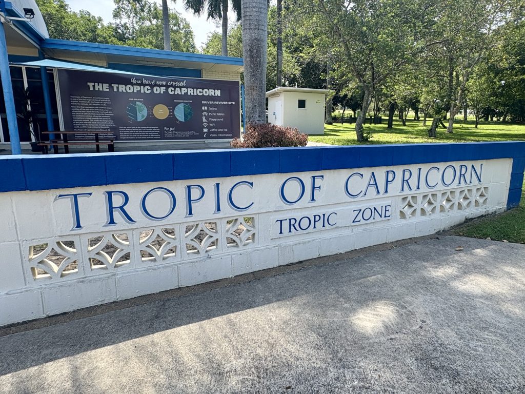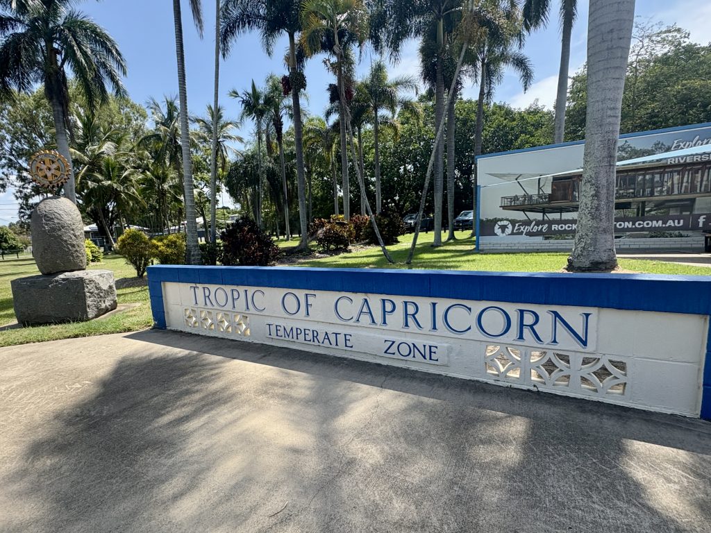 Bright and early the next morning we were up and on the road. We’d calculated that it was around 916 miles to Port Douglas, just under seventeen hours of driving. Next up was Yeppoon, a five hour drive up the coast. This part of the drive took us over the Tropic of Capricorn, so we made a couple of stops in Rockhampton. First was the original location of the line as some of the walls remain there. The TOC line isn’t static so probably not strictly accurate. In 1980 due to the highway being redirected the spire was moved to it’s current location and walls rebuilt to mark the Temperate and Tropic zone. We had hoped to spend a little more time in Rockhampton but the accommodation we had booked wanted us to check in by 3pm!